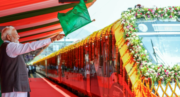 प्रधानमंत्री मोदी ने वाराणसी से चार नई वंदे भारत ट्रेनों को हरी झंडी दिखाकर देश के रेल नेटवर्क और बुनियादी ढाँचे को सुदृढ़ किया, जिससे बनारस-खजुराहो सहित चार प्रमुख रूटों पर यात्रा समय घटेगा। यह पहल आर्थिक विकास, पर्यटन को बढ़ावा देगी और विरासत शहरों को प्रगति का प्रतीक बनाएगी, अब भारत में 160 से ज़्यादा वंदे भारत ट्रेनें संचालित हैंप्रधानमंत्री नरेंद्र मोदी ने शनिवार, 8 नवंबर को बनारस रेलवे स्टेशन से चार वंदे भारत ट्रेनों को हरी झंडी दिखाई। ये नई वंदे भारत ट्रेनें बनारस-खजुराहो, लखनऊ-सहारनपुर, फिरोजपुर-दिल्ली और एर्नाकुलम-बेंगलुरु रूट पर चलेंगी। प्रधानमंत्री मोदी ने नई बनारस-खजुराहो वंदे भारत एक्सप्रेस में बच्चों से बातचीत की। प्रधानमंत्री मोदी ने कहा, “काशी-खजुराहो वंदे भारत के अलावा, फिरोजपुर-दिल्ली वंदे भारत, लखनऊ-सहारनपुर वंदे भारत और एर्नाकुलम-बेंगलुरु वंदे भारत को भी आज हरी झंडी दिखाई गई है। अब भारत में 160 से ज़्यादा नई वंदे भारत ट्रेनें चल रही हैं।” प्रधानमंत्री मोदी ने कहा, “तीर्थ स्थलों को वंदे भारत नेटवर्क के ज़रिए जोड़ा जा रहा है… यह भारत के विरासत शहरों को देश की प्रगति का प्रतीक बनाने की दिशा में एक कदम है।प्रधानमंत्री नरेंद्र मोदी ने शनिवार को चार नई वंदे भारत एक्सप्रेस ट्रेनों को हरी झंडी दिखाई। ये चारों ट्रेनें बनारस-खजुराहो, लखनऊ-सहारनपुर, फिरोजपुर-दिल्ली और एर्नाकुलम-बेंगलुरु रूट पर चलेंगी। चार नई वंदे भारत ट्रेनों को हरी झंडी दिखाने के बाद एक जनसभा को संबोधित करते हुए, प्रधानमंत्री ने कहा, “अधिकांश देशों के विकास में बुनियादी ढांचे ने महत्वपूर्ण भूमिका निभाई है… किसी भी शहर का विकास बेहतर कनेक्टिविटी मिलते ही अपने आप शुरू हो जाता है… बुनियादी ढांचा केवल विशाल पुलों और राजमार्गों तक सीमित नहीं है।”